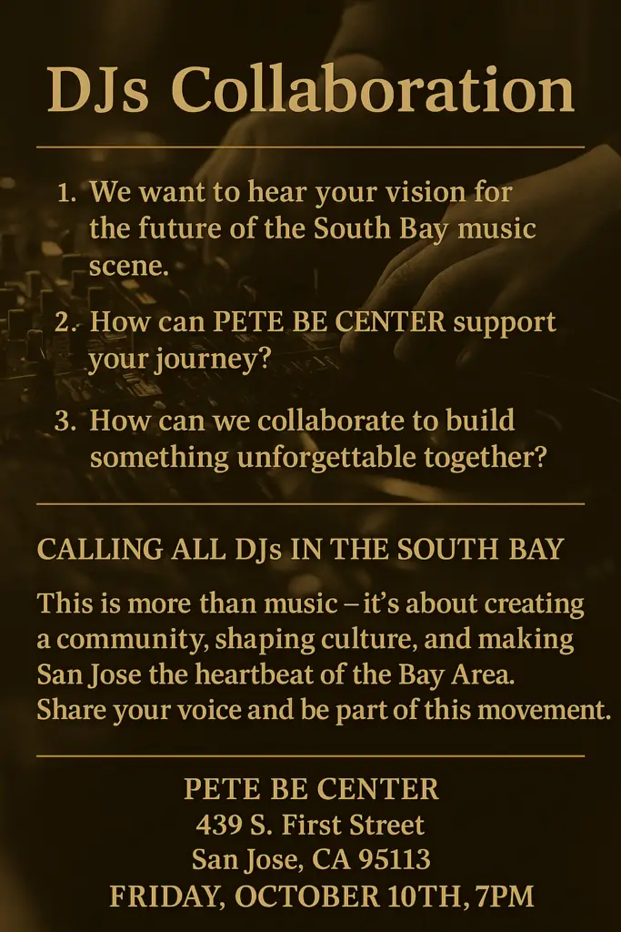 This is your chance to share your sound, your story, and your spirit. Join PETE BE CENTER and help us make San Jose the heartbeat of the Bay Area music scene.